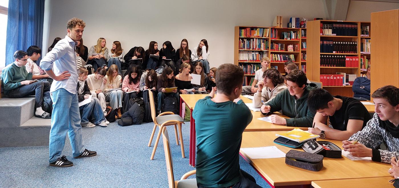 Der Poetry-Slam-Vizeweltmeister Emil Kaschka war im Rahmen der Themenwoche „Österreich liest! Treffpunkt Bibliothek“ zu Gast am BRG Imst. Inspiriert von seinem Text über einen toten Riesen in den Karnischen Alpen und die Erkenntnis, dass wir im Internet alle Riesen sind, die sich vor Meinungsblasen und Hass in Acht nehmen müssen, ging es für die SchülerInnen der 6A, 6B und 7A über ein paar Aufwärmübungen zur eigenen Textproduktion.